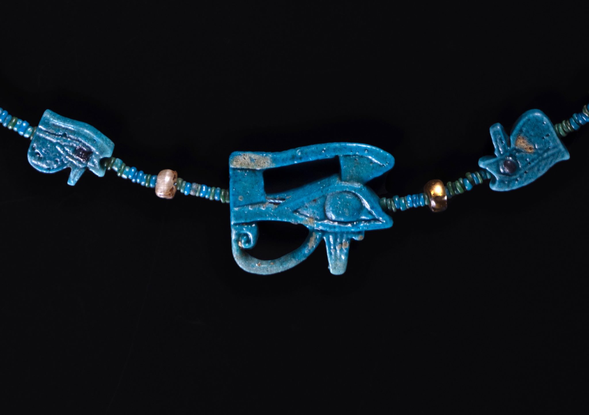 Thirteen separate protective wadjet eye amulets, made from Egyptian faience in molds, decorate this necklace. The most popular of all Egyptian amulets was the wadjet eye, which was worn to promote health and well-being.