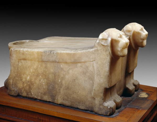 Sculpted from single block of alabaster, this altar was used either as a sacrificial altar or a libation table. It is decorated with the forms of two lions, whose front and back paws are beautifully defined.